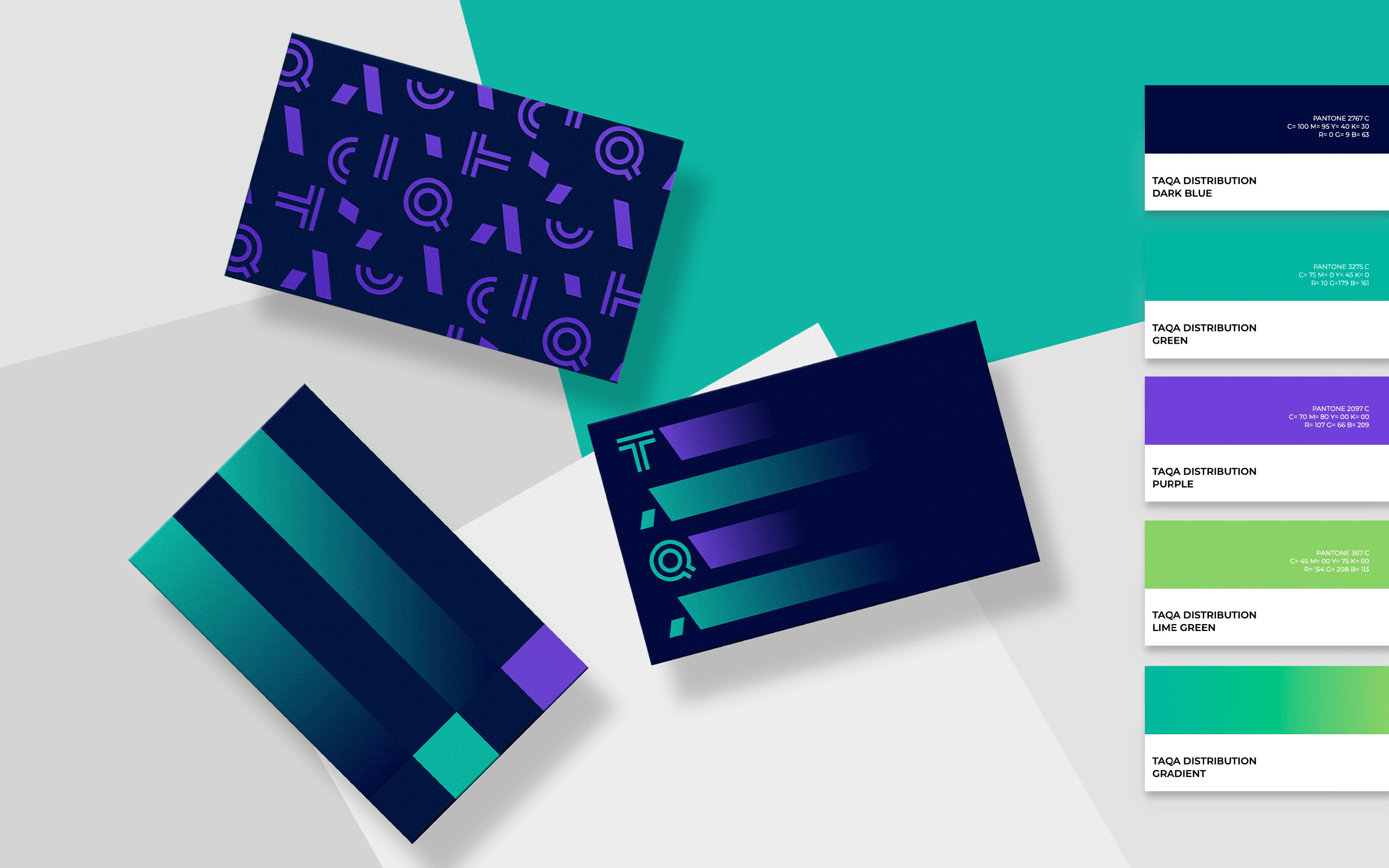 Green anchors the brand with reassurance — calm, clean, andsteady, it speaks to the energy that flows reliably into homes and communities every day. Purple adds depth: credibility, innovation, and wisdom woven into every touchpoint. And as the gradient shifts from green to lime, it mirrors the brand's own movement — from stable infrastructure to vibrant, living communities. The pattern brings it all to life. Drawn directly from the letters of the TAQA wordmark, the confetti-like master pattern scatters each letterwith intention — energetic, celebratory, and completely ownable. TAQA Distribution isn't just managing networks, it's touching lives — Powering Communities.